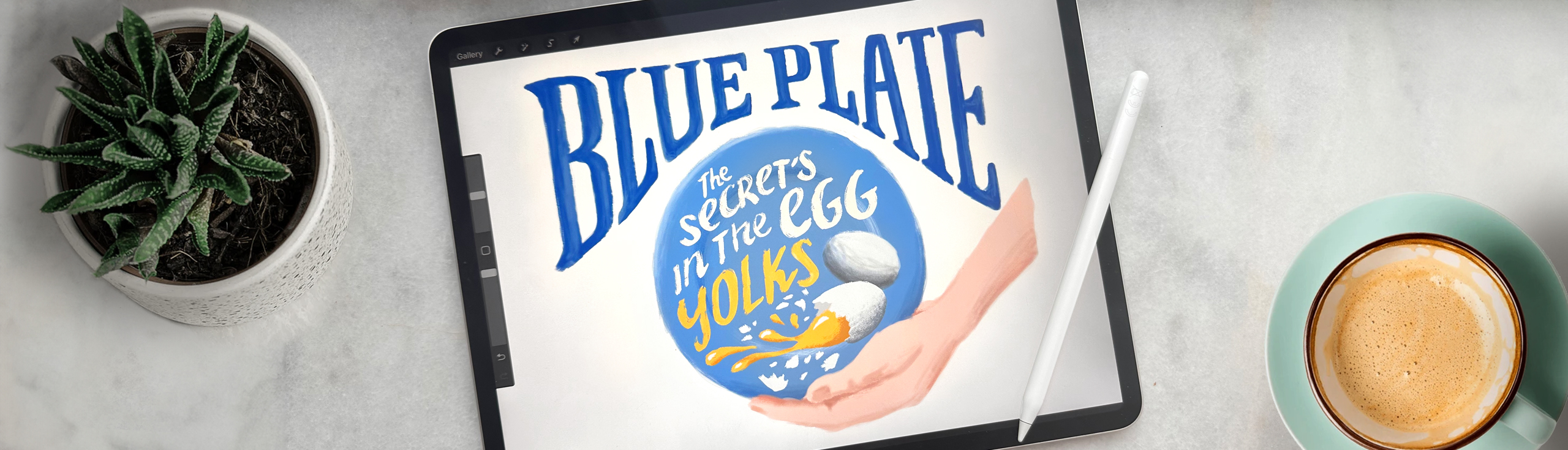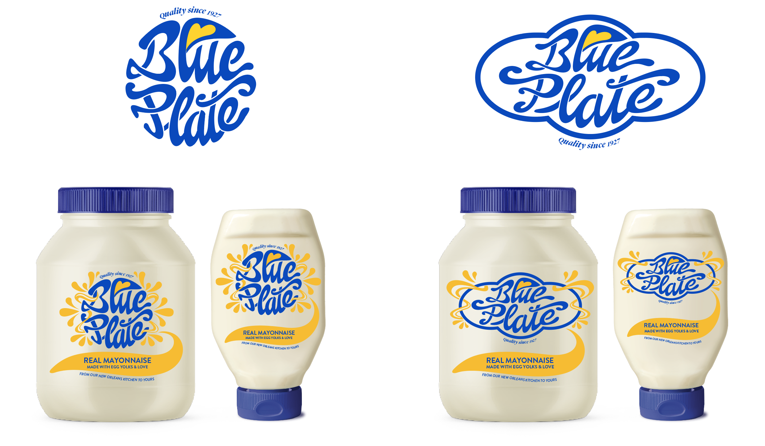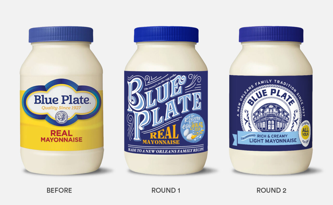 Inspired by antique typography, a hand lettered and hand illustrated route exudes ‘Blue Plate is quality’ through a high level of artistry and heart, disrupting shopper attention with a burst of nostalgia that speaks to Blue Plate’s staple New Orleans status – first by showing, then by explaining. Real Mayonnaise says what it is – choosing clarity over cleverness. Detail draws you into the experience: ‘made to a New Orleans family recipe’ forms a tertiary callout benefit. While ‘Rich and creamy egg yolks’ is integrated seamlessly into the style of the design – with freshly cracked eggs illustrated to give a feeling of homemade and to add the vibrancy and energy of a meal about to be made. Scroll down to see our design in progress from scamp to final execution.